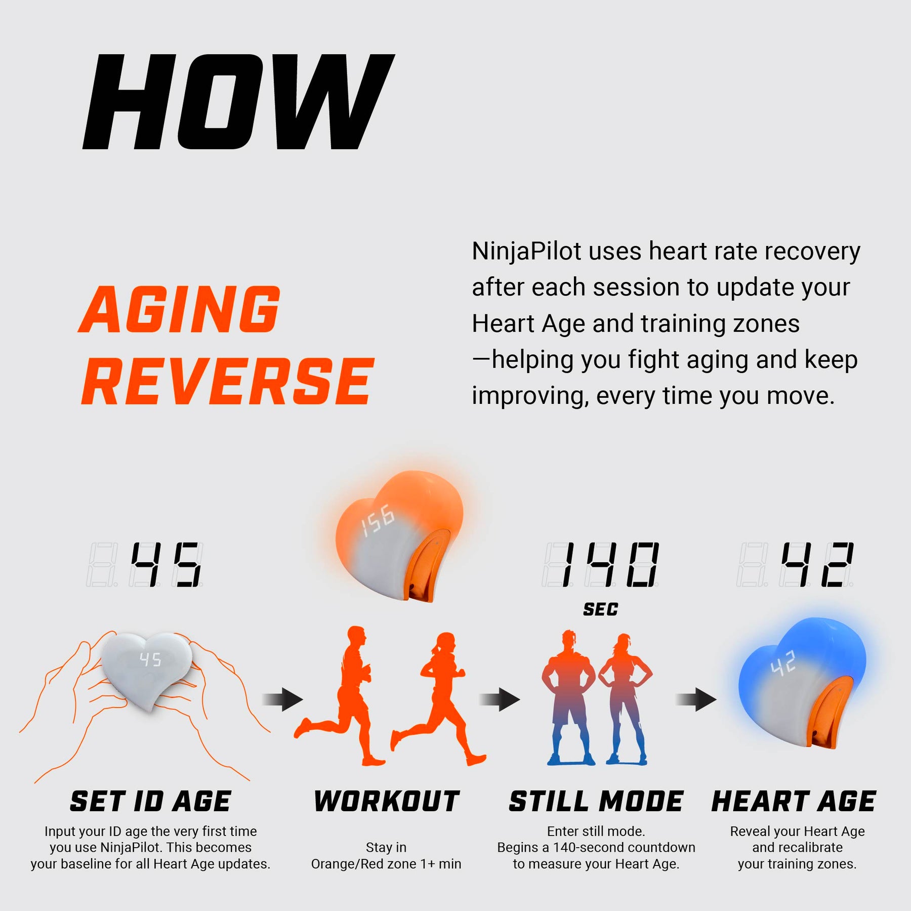 NinjaPilot is your personal aging reverser — a heart-powered training device designed to measure your Heart Age, monitor your heart rate zones, and guide you toward better, more effective workouts. It integrates heart rate tracking, Heart Age measurement, and adaptive zone shifting into one compact device — no apps or extra gear needed.